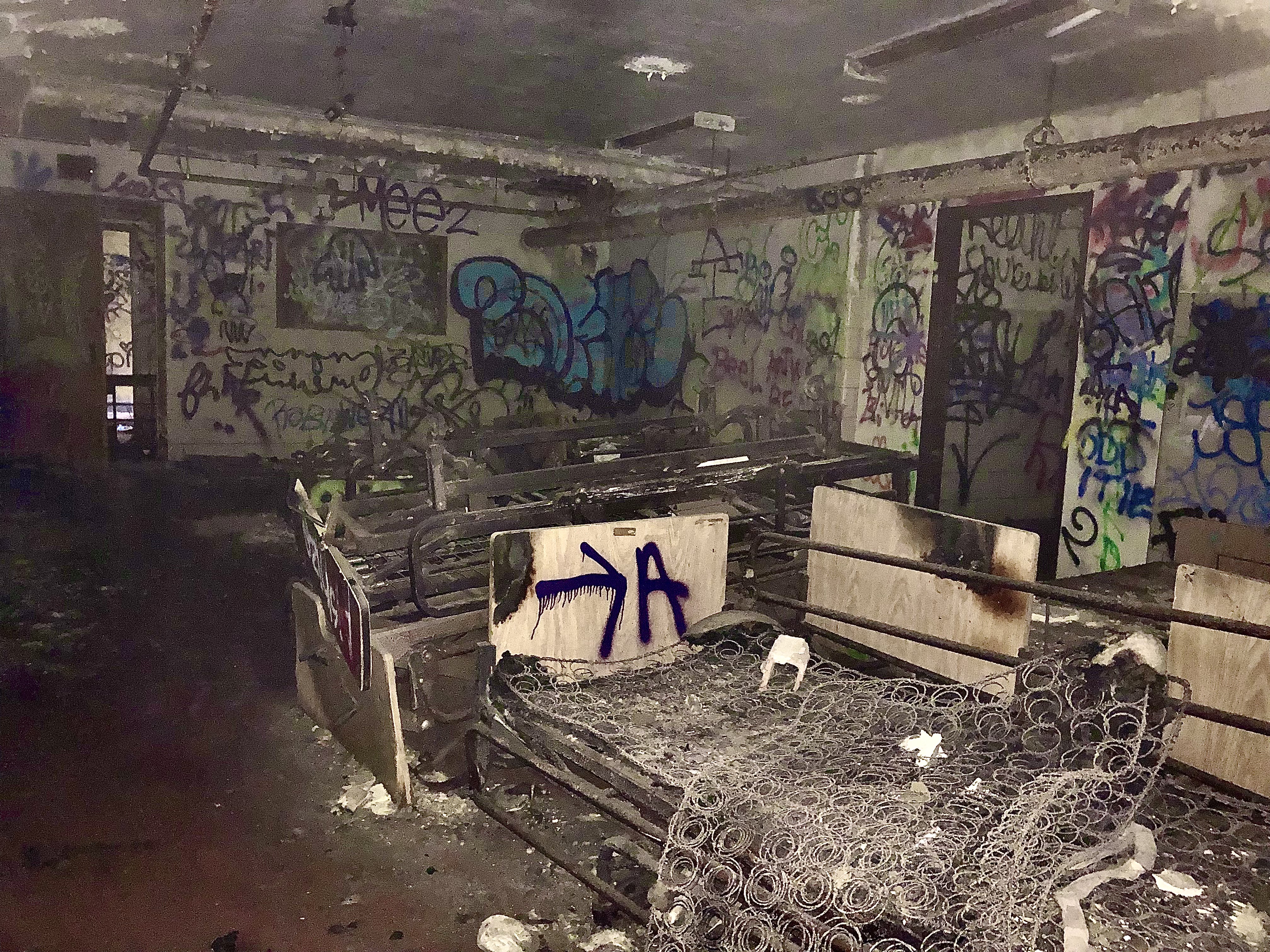 You continue on down the dark and dilapidated hallway and come across a room at the end that has a pile of old, metal, hospital beds. You walk around them and look under them while calling out Benjamin's name, but he's nowhere to be seen. You decide it's time to head back the way you came.