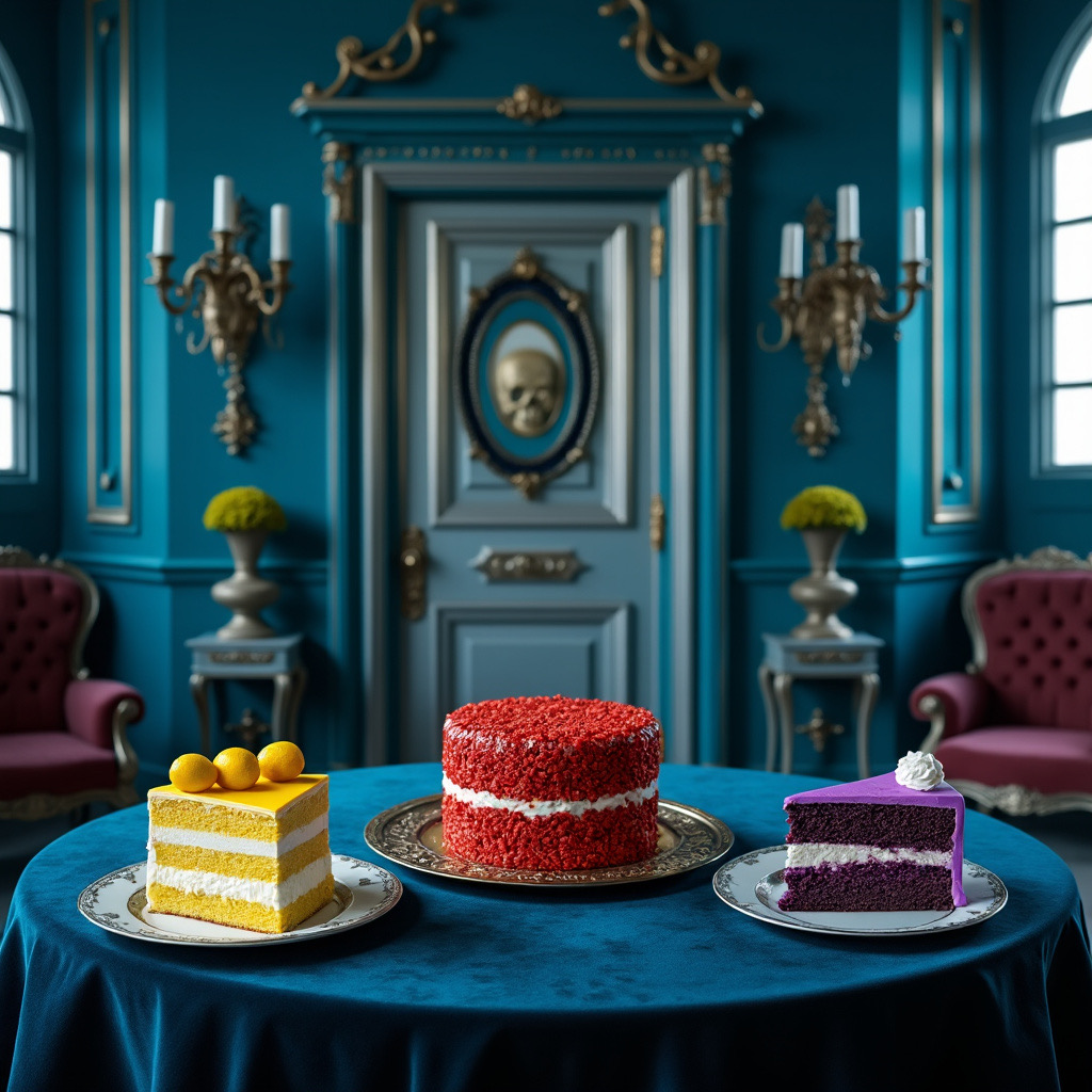 In the center sits a low mahogany table, its surface marred with a web of old rings and a single deep scratch that leaks a darker stain. On a china plate, under no dome or cover, rest three small pieces of cake: one yellow as preserved lemon, one red like a secret wound, and one purple the color of bruises. They seem freshly cut, crumbs sharp and untouched, though a thin film of dust threads among them, as if time cannot decide whether to preserve or consume. A faint, barely audible ticking seems to come from the table itself, syncing with the slow pulse in the wallpaper's pattern. Each tick makes the cakes' shadows twitch, as though something beneath them breathes. Just then, the whispers tell you to eat one of the cakes, but which one?