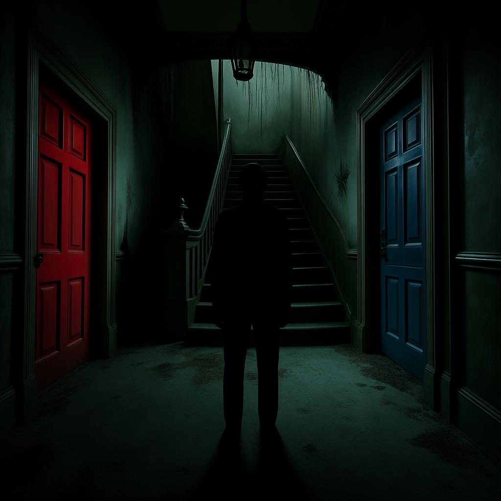 On the right, a pale blue door looms, its edges frayed and chipped-a contrast to the oppressive darkness that envelopes the room. A chilling breeze seeps through the gap, carrying with it an echo of soft, melancholic whispers. It beckons you like a siren's call, promising secrets of the manor's tragic history lurking just beyond its threshold.