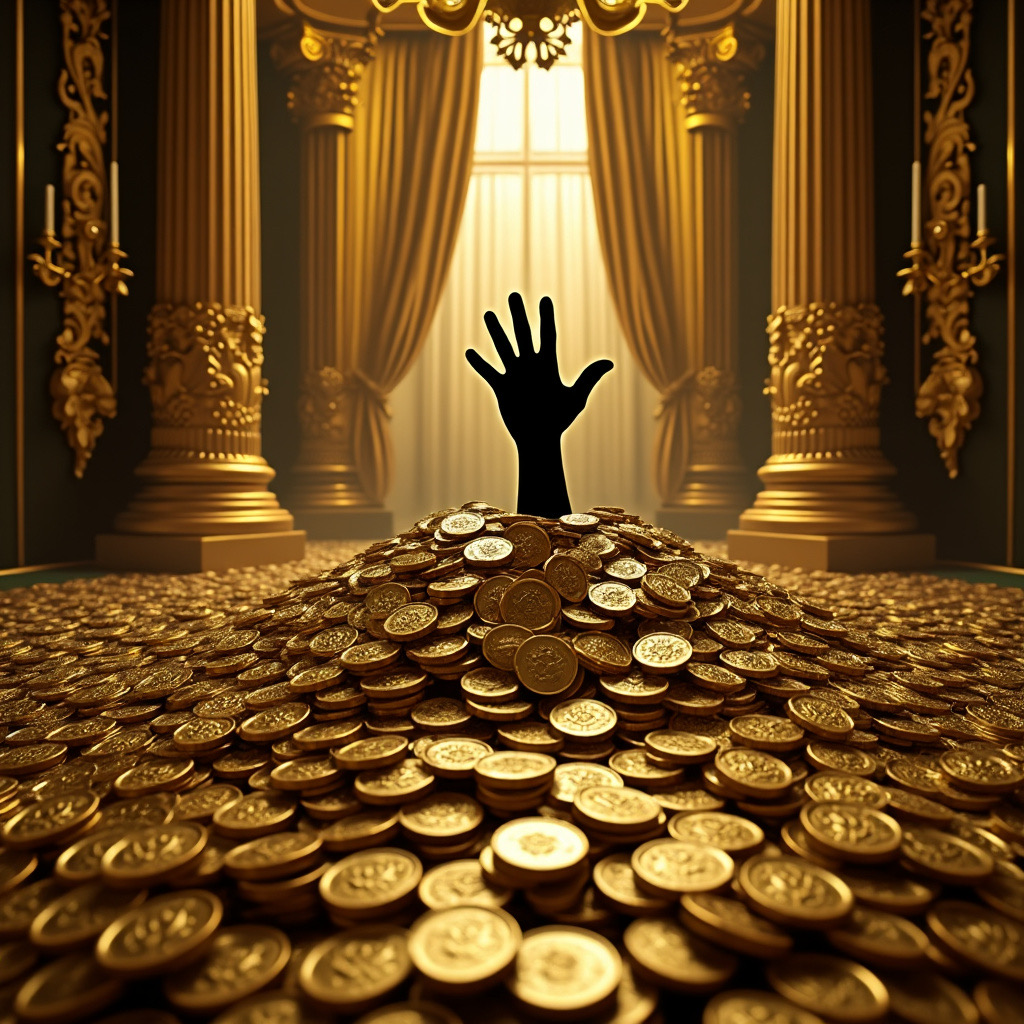 You pick up the golden coins. The coins feel like pure wealth and opulence in your hand. Just then, the coins start multiplying in your hand. one into two and then two into four. The coins eventually multiply enough to fill up the room. You try to swim to the top, but eventually the coins submerge you beneath.