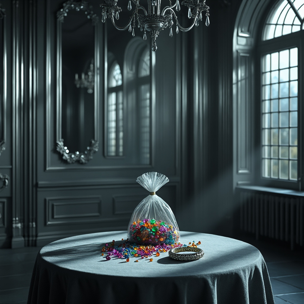 At the heart of the room stands an ornate, antique table, its surface polished to perfection. On this table rests a striking silver ring, intricately designed with delicate engravings that seem to glimmer with a life of their own. Beside it, a velvet bag spills over with an assortment of gems—rubies, emeralds, sapphires, and diamonds—each one sparkling ominously under the dim light, hinting at untold stories and hidden treasures. The juxtaposition of the elegant table and the encroaching shadows creates an aura of both beauty and foreboding, making the silver room a hauntingly captivating space within the mansion. The whispers of the mansion tell you to make a choice. What will you choose?
